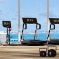 — Resort style pool with cabanas, floating daybeds, and a signature sculpture